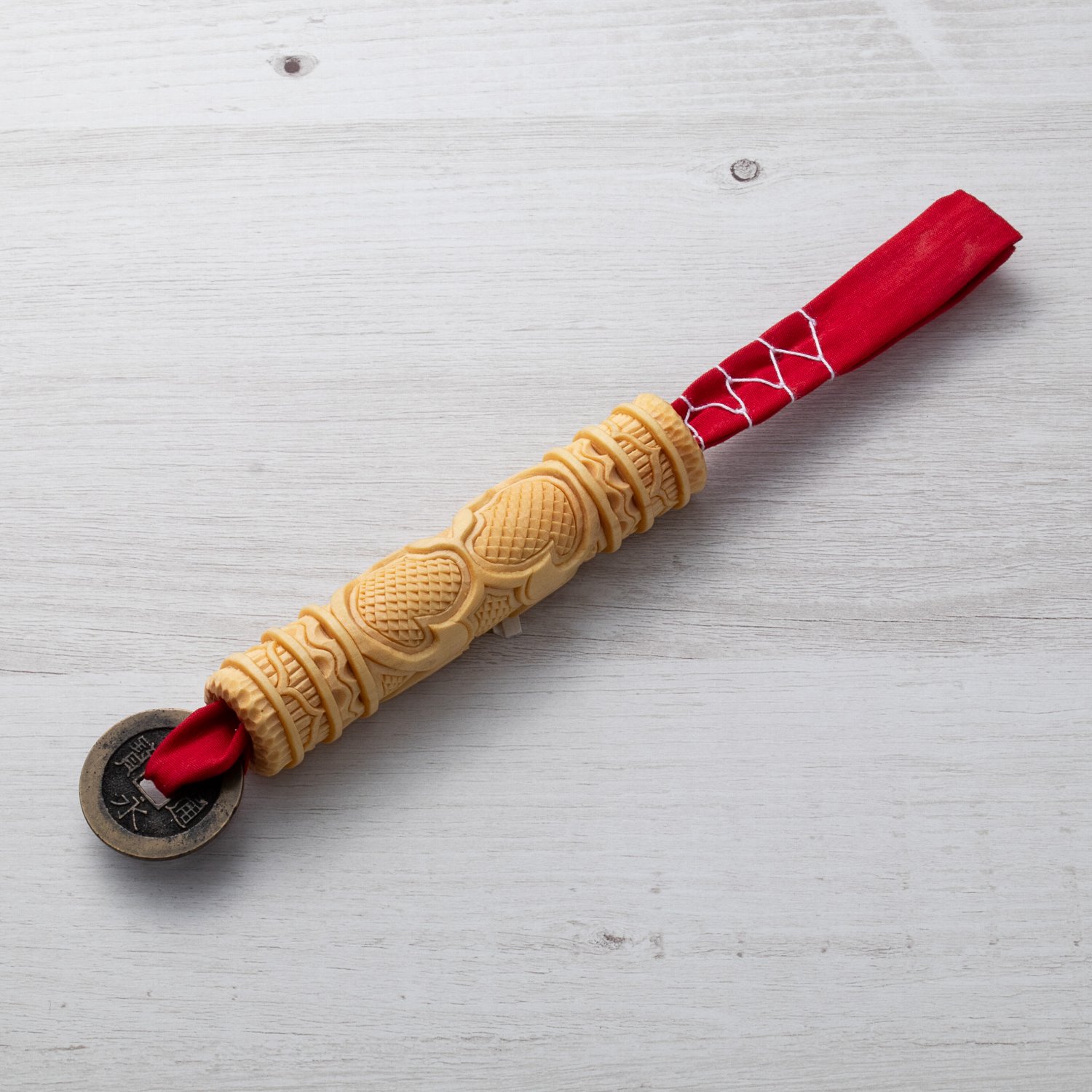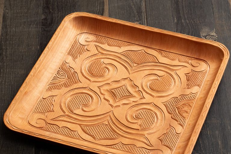 現在は主にイタ(※1)とチシポ(針入れ)を製作。特にこれらのアイヌ文様の間に入れるラムラムノカ(ウロコ彫り)の繊細で深い彫りは、作品に強い印象を与える。