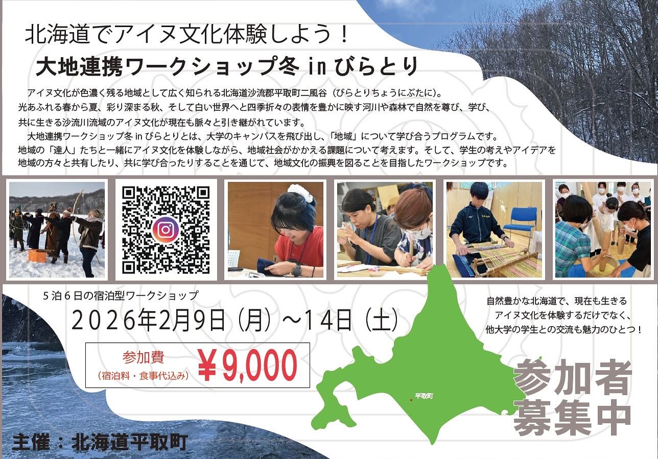 毎年夏、冬に平取町二風谷で開催される「大地連携ワークショップ」の募集開始のお知らせです。